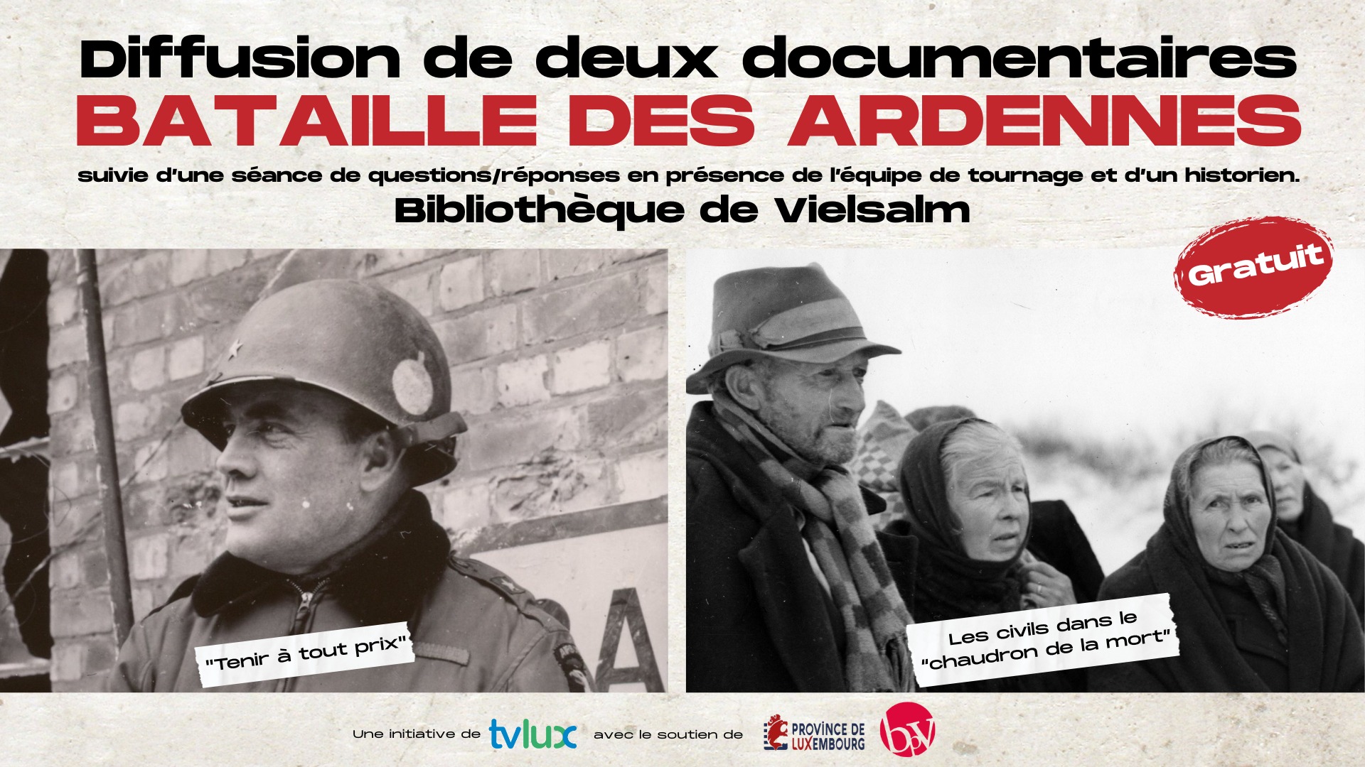 Le jeudi 5 mars à 20h, TV Lux organise, avec le soutien de la Province de Luxembourg, la diffusion de deux documentaires consacrés à la Bataille des Ardennes (Tenir à tout prix, Les civils dans le « chaudron de la mort ») à la Bibliothèque Publique de Vielsalm. 🎬