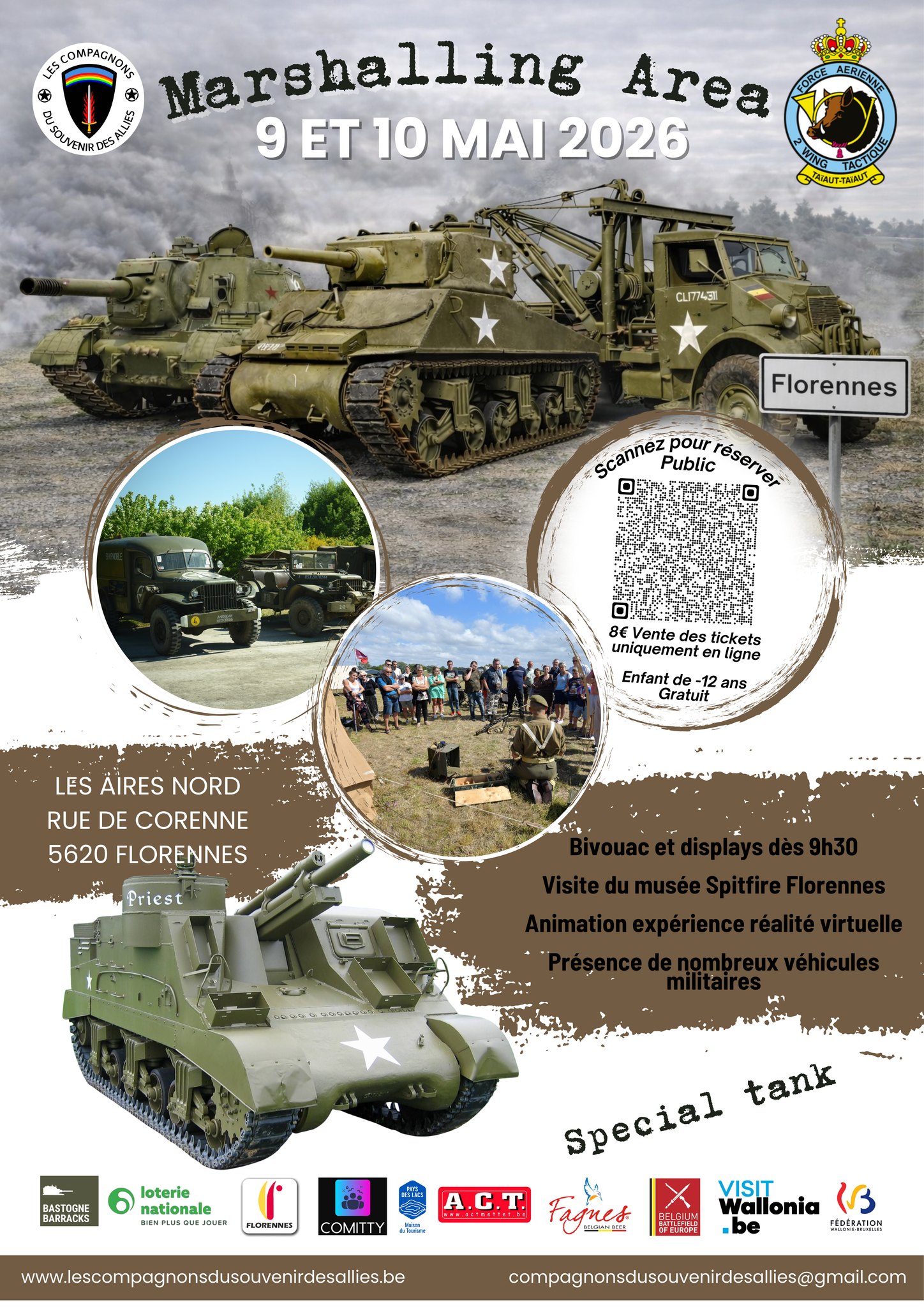 Les Compagnons du Souvenir des Alliés ont le plaisir d’annoncer la réédition de leur camp Marshalling Area. Cette reconstitution aura lieu le 9 et 10 Mai à la base militaire de Florennes. Ce weekend vous attend un Camp de reconstitution historique, une exposition de véhicules et de matériel, une présence renforcée de reconstituteurs Alliés et Allemands WH, ainsi que des chars, du matériel lourd et un concert.